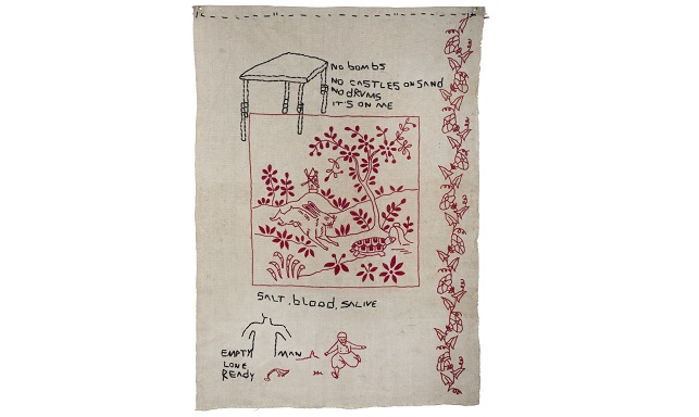Image: José Leonilson Bezerra Dias, Empty Man, 1991, Thread on embroidered linen, 20 7/8 x 14 9/16 in (53 x 37 cm). Família Bezerra Dias/Projeto Leonilson. © Projeto Leonilson